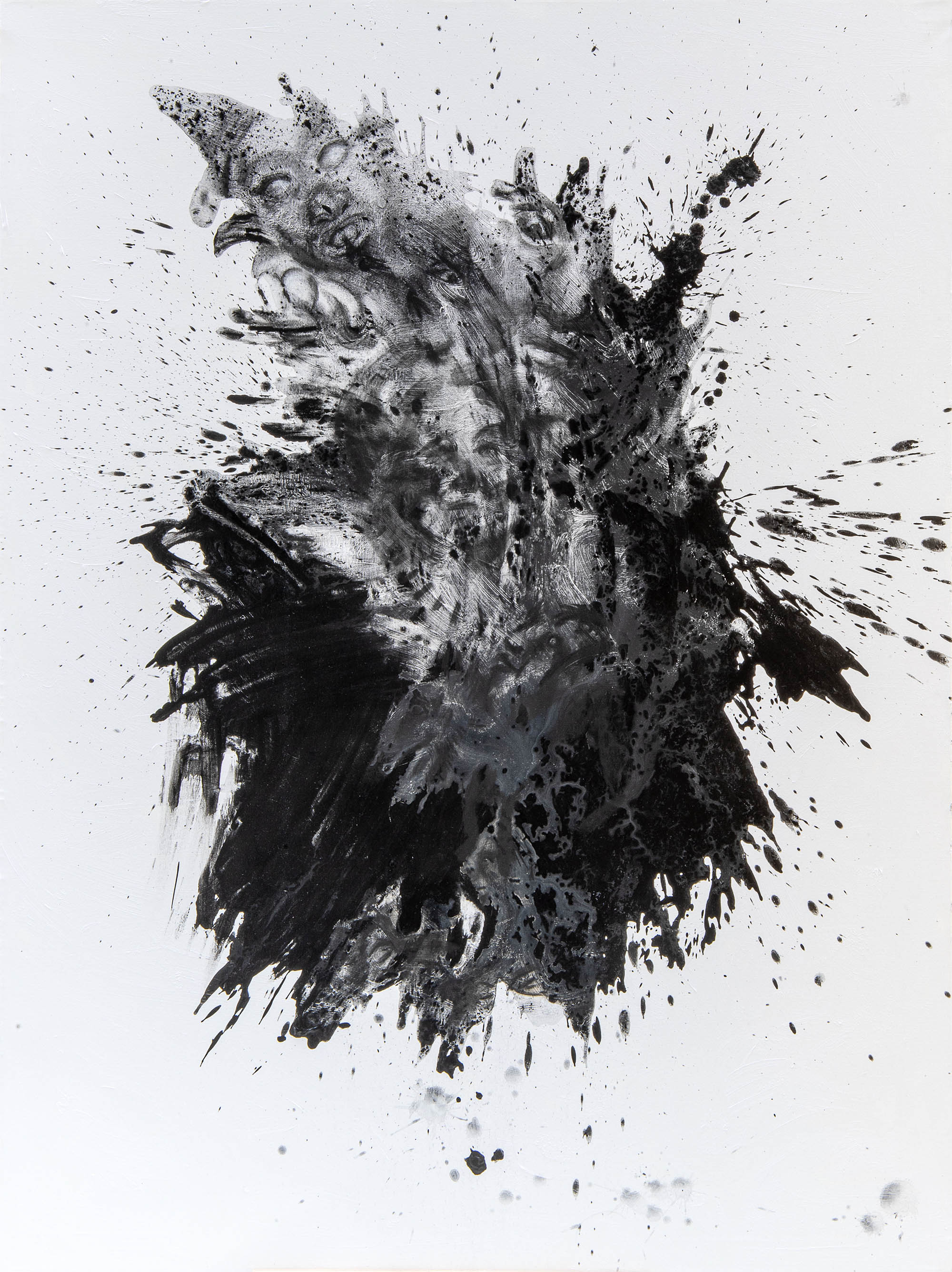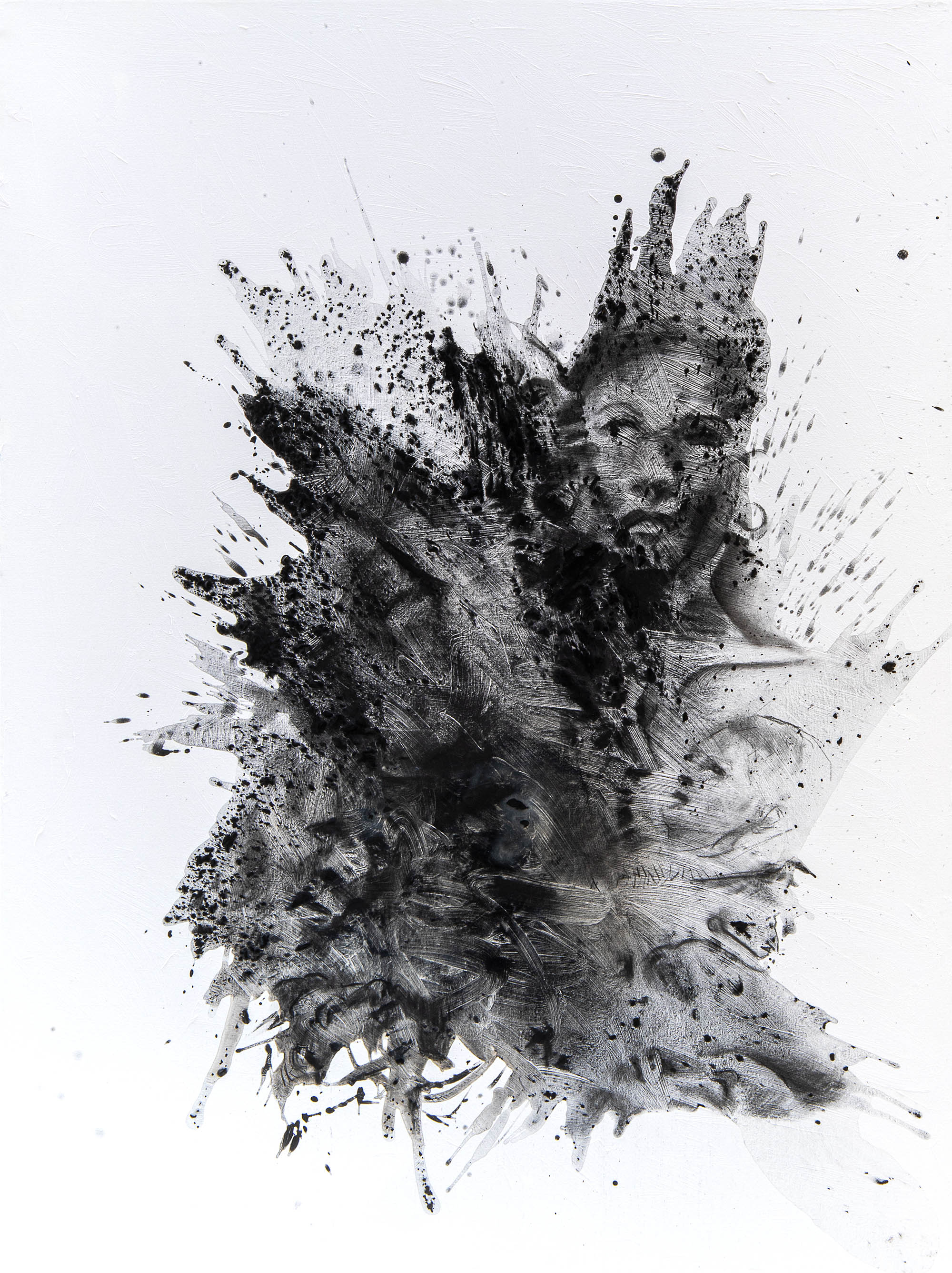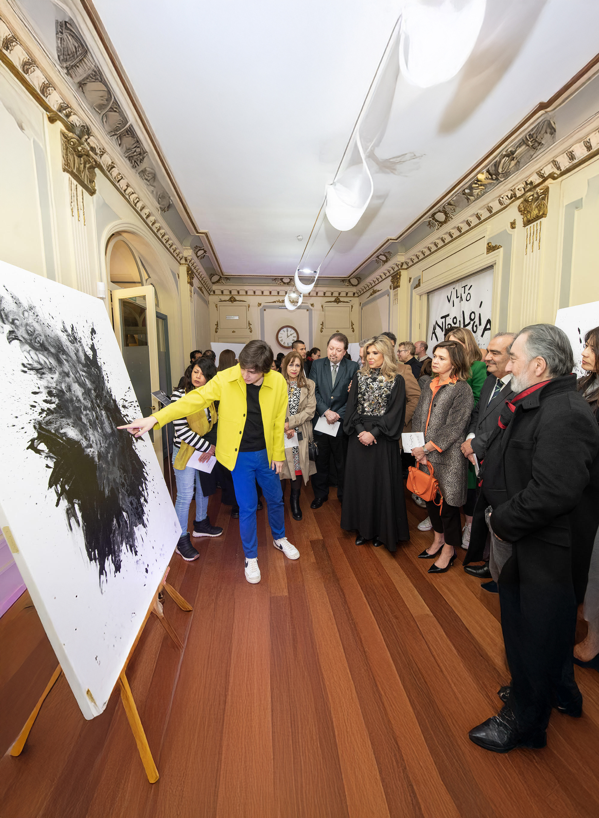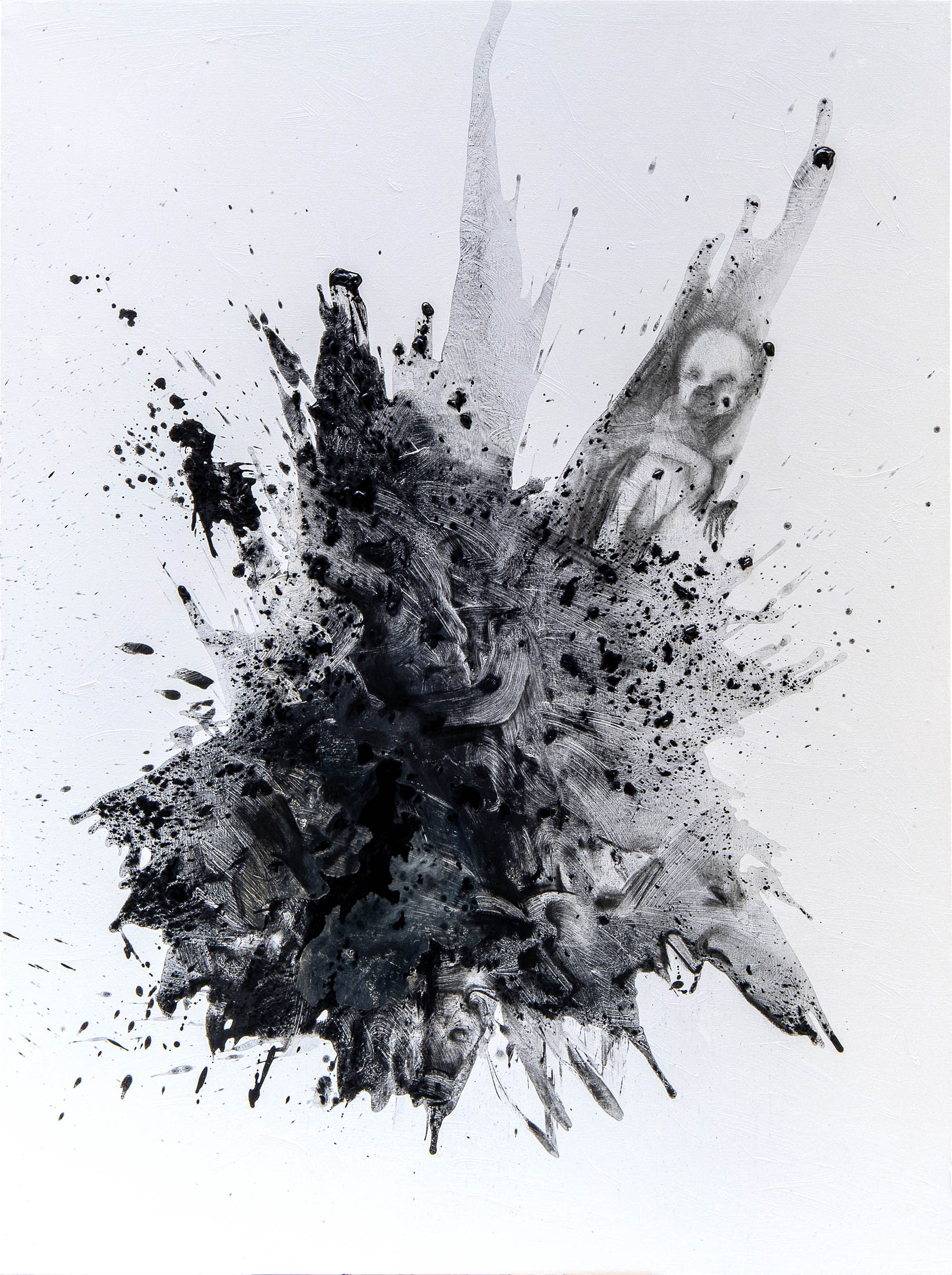Las piezas tienen un inicio aleatorio: el salpicón. Si bien es verdad que se juega con las distintas disoluciones del acrílico, a veces se agita y no se revuelve, el resultado inesperado depende en gran medida de la proyección sobre la tela. Este primer proceso pretende romper con las ideas prestablecidas antes de empezar con los descubrimientos.